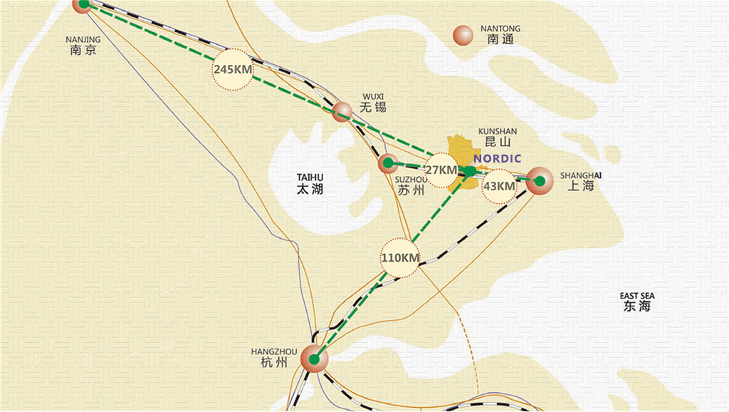 北欧创新园距离苏州27 公里、上海43 公里、杭州110 公里、南京245 公里,水陆空联运,构建出便捷密集的现代交通网。